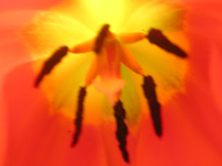 I went out with my camera into the garden today, hoping to capture the technicolour tulips. They've only just begun to flower. At the weekend they were being modest. Slim buds giggling in corners for the wind to nudge and snigger over. Now they're splaying their innermost secrets for the sunshine to smile into!